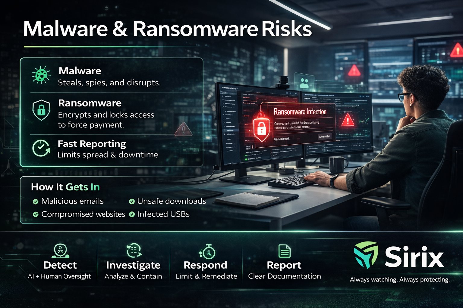 🦠 Malware Steals, spies, disrupts, or creates hidden access. | 🔒 Ransomware Encrypts and locks access to force payment and pressure. | 🚨 Fast reporting Helps contain spread and reduces downtime. |